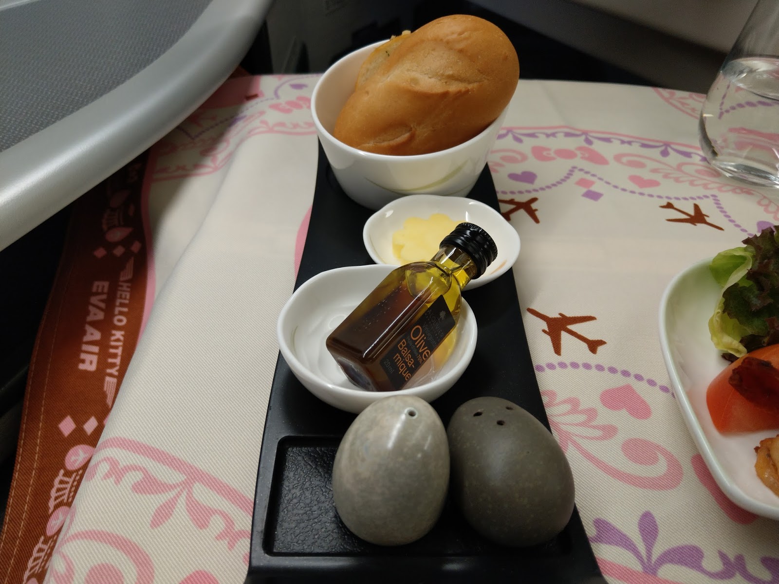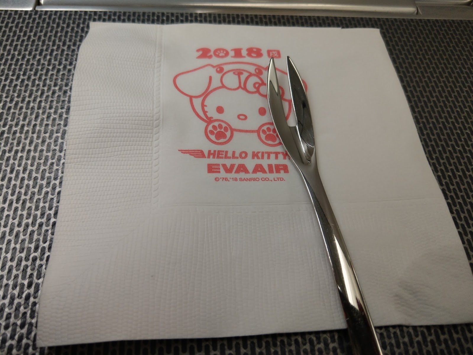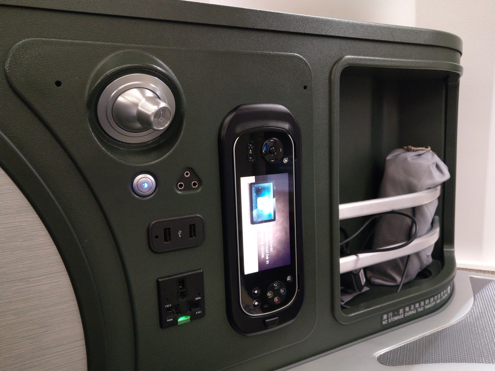 皇璽桂冠艙的座位外觀,過夜包和睡衣都放在位置上了。還有 Hello Kitty 的各式備品